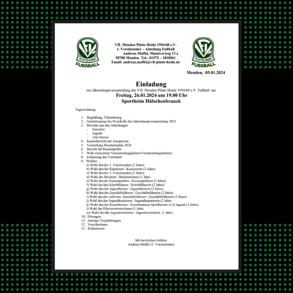 Eure Teilnahme ist wichtig! Lasst uns gemeinsam über die Zukunft unseres Vereins sprechen und besondere Momente feiern. Wir freuen uns auf zahlreiches Erscheinen! ⚽👏 #VfLPlatteHeide #Jahreshauptversammlung #jugendtag #grünweiß #vflplatteheidefussball #💚🤍