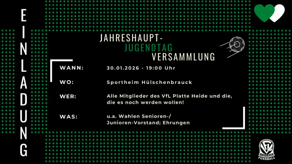 Eure Teilnahme ist wichtig! Lasst uns gemeinsam über die Zukunft unseres Vereins sprechen und besondere Momente feiern. Wir freuen uns auf zahlreiches Erscheinen! ⚽👏 #VfLPlatteHeide #Jahreshauptversammlung #jugendtag #grünweiß #vflplatteheidefussball #💚🤍